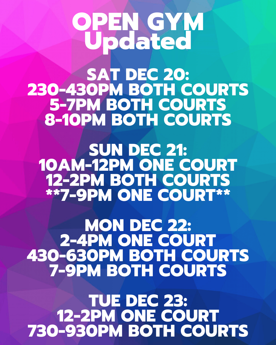 Please keep following both our Instagram and Facebook posts and stories for the most updated information regarding our OPEN GYM times.